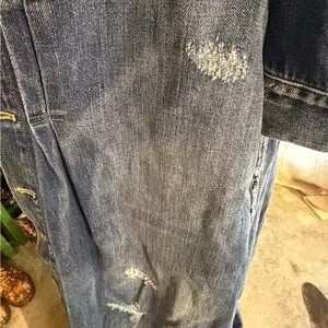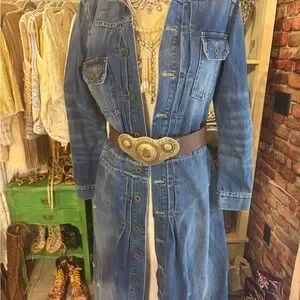 Long button-front denim dress with a tailored waist. Maxi length with front slit. Classic blue denim styling. Versatile layered look. Wear it as a dress or coat, two extra buttons on a side to cinch the waist more