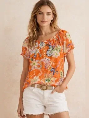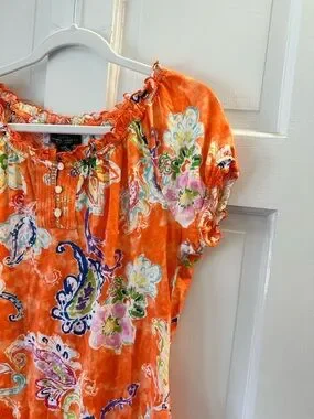 Lauren Ralph Lauren LRL Orange Floral Paisley Peasant Top Size S