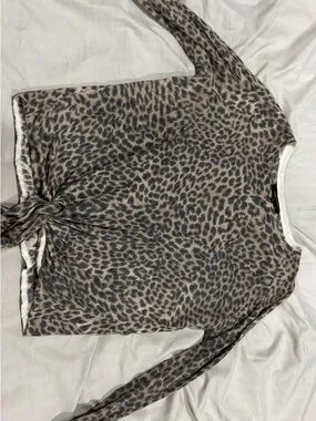 Leopard print long sleeve top with a front knot detail. Lightweight, soft fabric for easy layering. Neutral taupe and black tones for versatile styling. Crew neckline with contrast trim. Chic everyday look.