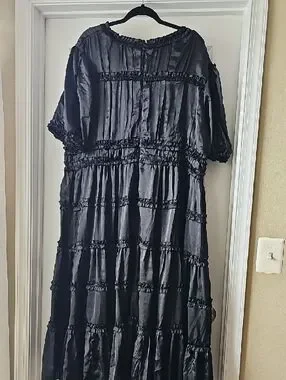 Flowy tiered maxi dress with subtle ruffled trim. Scoop neckline with short sleeves. Lightweight sheen fabric for an elegant drape. Relaxed silhouette that moves beautifully. Classic black for versatile styling.