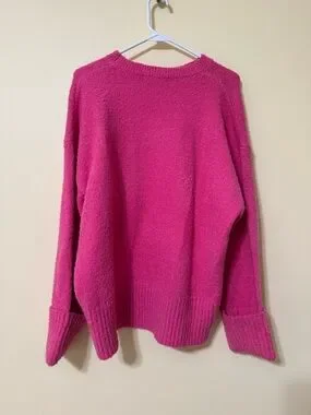 Soft fuchsia knit sweater with a relaxed fit. Lightweight boucle texture for comfortable wear. Ribbed cuffs and hem for subtle structure. Easy to style for everyday outfits.