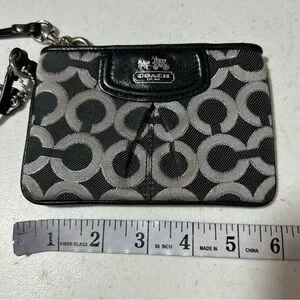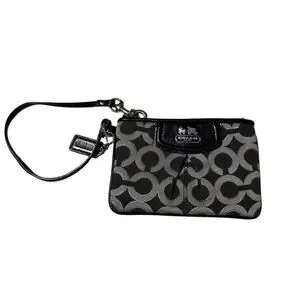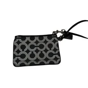 COACH Black Silver OP Art Wristlet GUC Logo Canvas Patent Leather Trim . Very light soiling on the outside. See pics. Smoke free home. Ships fast!
