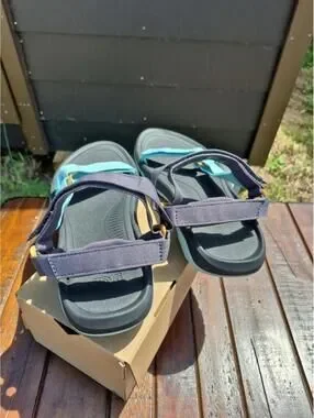 The Teva Hurricane XLT2 Sport Sandals in women's size 14 feature a stylish pastel turquoise color, ideal for hiking and outdoor activities during the summer and spring seasons. With a flat heel and rubber outsole for added comfort and durability, these sandals have a hook and loop closure for easy adjustment. Made with nylon upper material and synthetic lining, they are lightweight and perfect for casual wear. The Teva brand is known for quality and, in this model, the logo accents add a touch of sporty flair to the design.