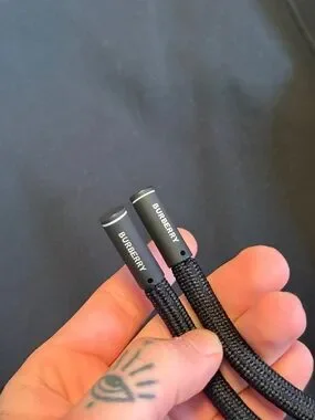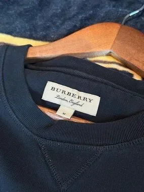 Burberry crewneck in black with signature beige plaid trim along sleeves and sides. Clean, streamlined fit with classic Burberry detailing. Easy to style for modern casual looks.