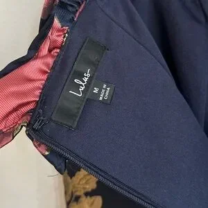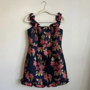 This Lulus dress is perfect for the holiday season or any festive parties. The dress features a pink/red and gold floral brocade design on a deep navy blue background. The straps and hem are ruffled, giving it a fun and flirty feel.