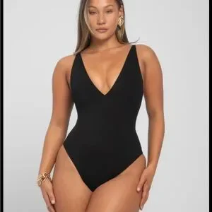 Sleek black one-piece swimsuit with a flattering V-neck. Provides smooth, supportive coverage and a streamlined silhouette. Versatile style for beach or poolside wear. Easy to pair with cover-ups and accessories.