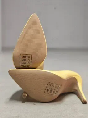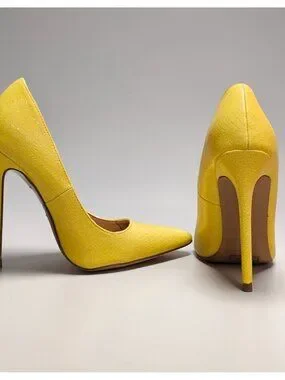 These vibrant yellow high heels feature a chic faux snakeskin texture and pointed toe design. Offering a comfortable fit, they are perfect for elevating a professional wardrobe or evening ensemble.