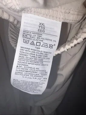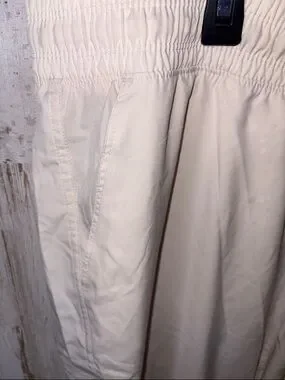 with an elastic drawstring waist. Simple, flowing silhouette. Side pocket with visible brand tag. Versatile and easy to style.