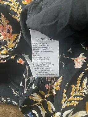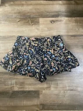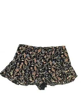 Flowy shorts with layered ruffle hem. Black base with delicate floral print. Elastic back waist for easy wear. Feminine and breezy for warm days.