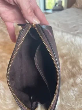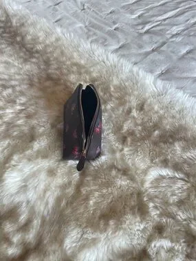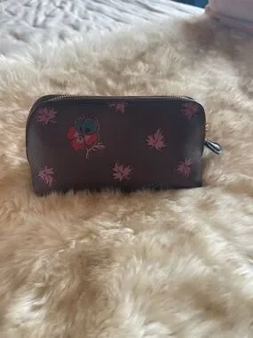 Coach Dark Brown Floral Zip Cosmetic Pouch with Pink Accents