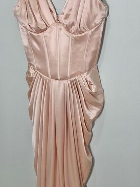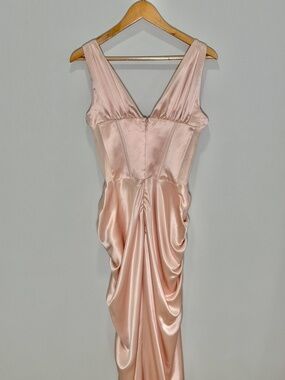 Details: Blush satin corset maxi dress, structured boned bodice, sculpting fit, draped hip detailing, maxi length, hidden back zip closure