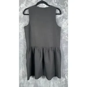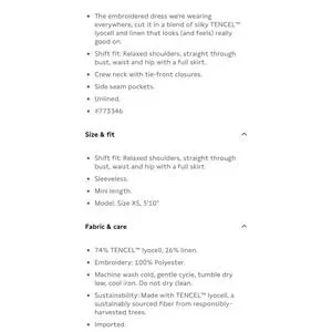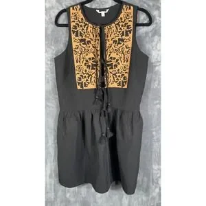 Banana Republic Embroidered Tencel Linen Mini Dress in Black. This shift-fit dress is crafted from a silky blend of Tencel lyocell and linen, providing a lightweight and breathable feel. It features intricate tan embroidery on the chest, a crew neck with tie-front closures accented by tassels, and a sleeveless silhouette. Designed with side seam pockets and a full skirt, this unlined dress offers a relaxed yet polished look perfect for warm-weather styling.