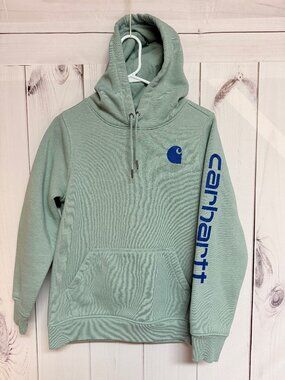 carhartt womens hoodie jade green medium, clarksburg graphic sleeve hoodie, relaxed fit sweatshirt, womens workwear hoodie, fleece lined pullover, casual streetwear hoodie #Carhartt #Hoodie #Medium #Green #EUC