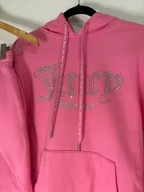 Bright pink two-piece sweat set with rhinestone 'Juicy Forever' logo. Hooded sweatshirt has drawstring and kangaroo pocket. Elastic-waist joggers with cuffed ankles for a snug fit. Comfortable, casual style for everyday wear.
