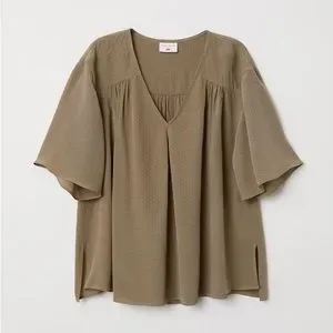 Loose-fit, short-sleeved blouse in crêped, textured-weave viscose. V-neck, pleat at front, and gathered yoke at back. Dropped shoulders with decorative gathers. Slits at sides and longer back section.