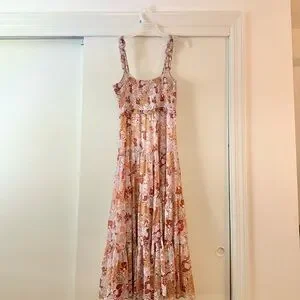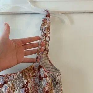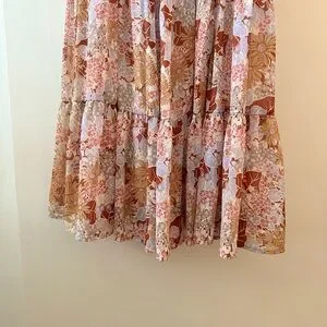ASTR the Label lightweight floral maxi dress. Smocked bodice with adjustable spaghetti straps and ruffle detailing. Slowly tiered skirt. “Rust Blue Floral” soft peach, blue, and cream floral print. Side slit.