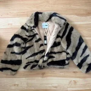Elevate your wardrobe with this tan and black faux fur zebra stripe jacket. Soft, plush fabric offers luxurious comfort and eye-catching texture. Boxy silhouette with a high collar creates a bold, fashion-forward look. Perfect for statement outfits and cool-weather layering.