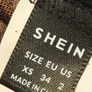 Close-up of a SHEIN clothing label. Shows size markings and brand name. Clear black woven tag with white text.