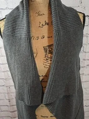 Sleeveless open front knit cardigan from Calvin Klein in size medium. Draped waterfall collar. Textured knit with zip pocket details. Versatile layering piece in a neutral gray. 60% Cotton, 40% Acrylic. Very good pre-loved condition - no pilling, hardly any signs of wear.