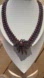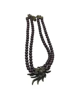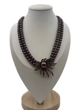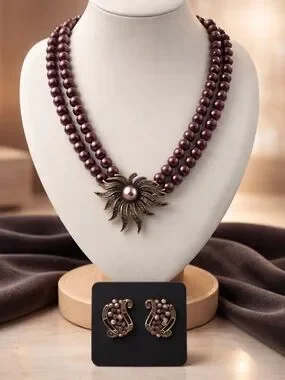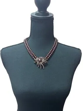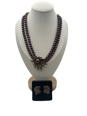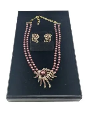 Rich Aubergine pearls form a double-strand necklace. Antique gold sunburst pendant centers a matching plum pearl. Coordinating clip-on earrings feature plum pearls and ornate gold-tone detailing. Striking vintage-inspired set for dressed-up looks.