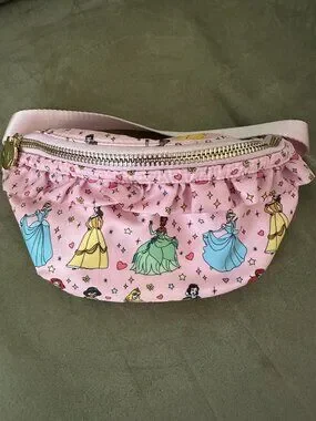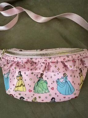 Stoney Clover Lane x Disney Princess limited edition Never Stop Dreaming classic size fanny pack. Allover princess character print in multicolor. Gold-tone zipper and hardware. Adjustable pink strap for hands-free wear. Exterior is like new, very light wear/marks inside.
