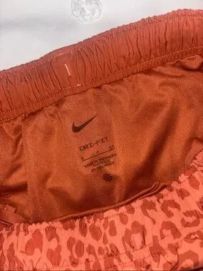Breathable Nike athletic shorts with bold rust leopard print. Elastic waistband for a secure fit. Curved hem allows free movement. Small reflective Swoosh on front for visibility.