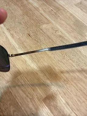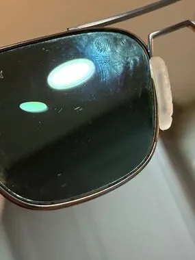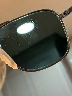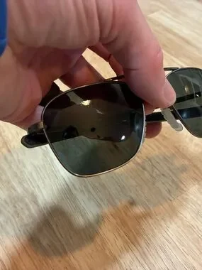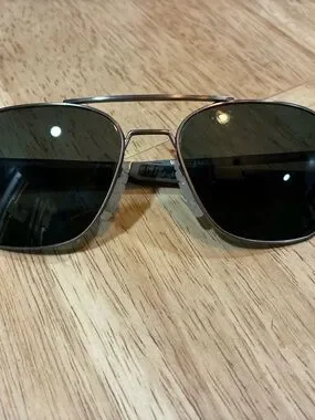Classic aviator-style sunglasses. Metal frame with double bridge. Dark green polarized-looking lenses. Comfortable nose pads and straight temples.