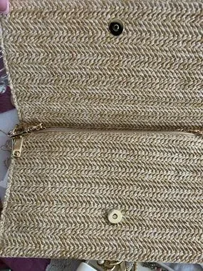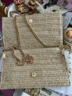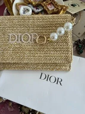 Dior Beige Straw Clutch with Pearl Handle and Gold Ring w gold chain crossbody