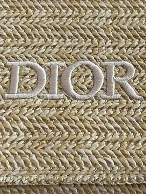 Woven straw clutch with embroidered DIOR logo. Pearl-bead handle with gold ring accent. Soft neutral beige tone. Chic and refined style for events.
