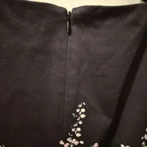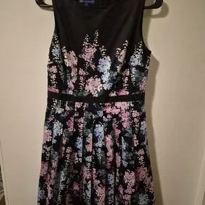 Talbots Black Floral Sateen Fit And Flare Midi Dress with Pink and Blue Blooms