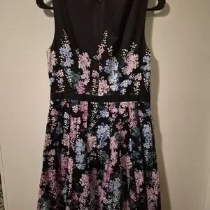 Sleeveless Talbots midi dress with a fitted bodice and flared skirt. Floral print in pink and blue on a black base. Subtle waist seam for shape. Classic, feminine silhouette ready to wear. Measurements are in pics. Never worn..no tags tho.