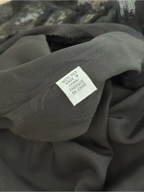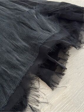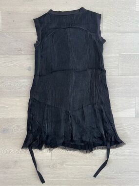 Beautiful black Moschino Jeans silk dress with sequin patchwork detailing on front. Raw edges and very nice seam work give it a very 1920’s flapper look. Two ribbons extend down from hem or can be tied up and hidden.