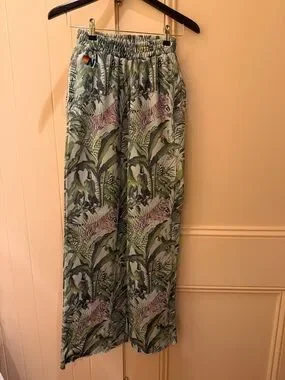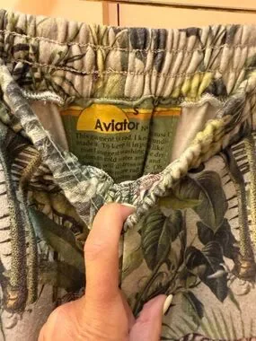 Aviator Nation two-piece set with jungle foliage and tiger print. Soft long-sleeve top and matching pants for comfortable sleep. Fun nature-inspired pattern.