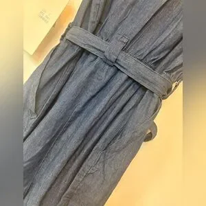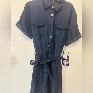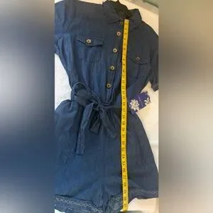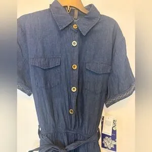 Soft denim jumpsuit with short sleeves and button front. Features chest pockets and a waist tie for shaping. Subtle embroidered cuff detail. Casual and versatile for everyday wear.