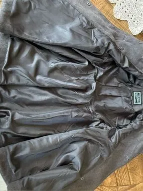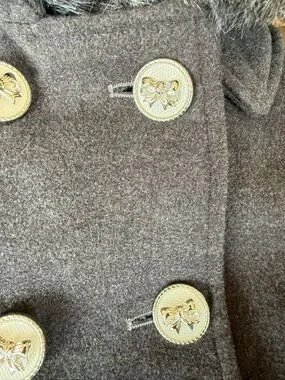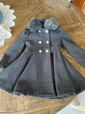 Dressy pea coat in a dark gray color. Double-breasted front with decorative buttons. Flared skirt for a classic silhouette. Faux fur collar adds a cozy, stylish touch.