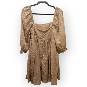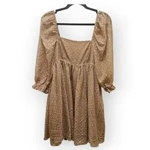 Keywords: Babydoll, Regencycore, Cottagecore, Metallic, Shimmer, Party Dress, Holiday, New Years Eve, Whimsical, Romantic, Puff Sleeve, Square Neck, Mini Dress, Gold Foil