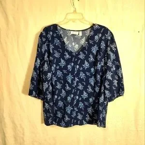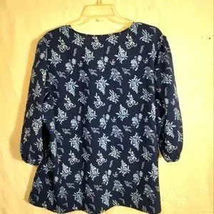 Navy blue with white floral and botanical design, button down top, 3/4 sleeves which are lightly gathered at bottom, very roomy women's 1X