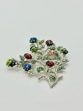 Silver-tone branch brooch with enamel ladybugs in multiple colors. Sparkling crystal flower accents. Playful and whimsical accessory. Bright mixed colors pop on the silver setting.
