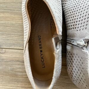 Step out in style with these Lucky Brand Bayley perforated ankle booties in taupe. Size 9. Excellent used condition.