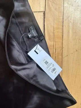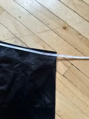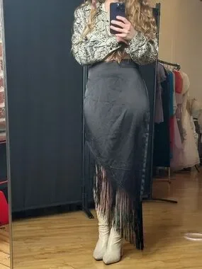 Elegant black satin skirt with flowing fringe along the hem. Smooth, shiny fabric adds a dressy touch. Eye-catching movement for evening looks.