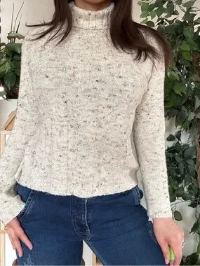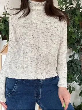 Cozy 90s knit with a mock neck and flattering cropped fit. Soft speckled texture—perfect with low rise jeans or layered for that effortless vintage vibe.