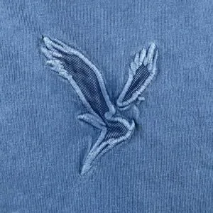 American Eagle long sleeve t-shirt in a faded blue wash. Crafted from 100% cotton "Super Soft" jersey, this standard fit tee features the iconic eagle logo embroidered on the chest and "AMERICAN EAGLE" text printed down the left sleeve. Designed with a classic crew neckline and ribbed cuffs for a comfortable, everyday feel.