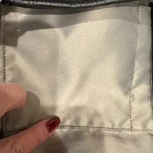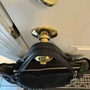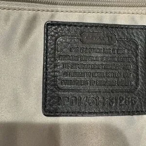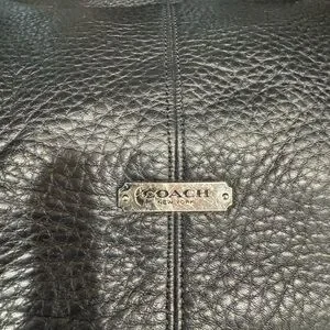 Black leather Coach bag featuring a detachable silver Coach logo charm.