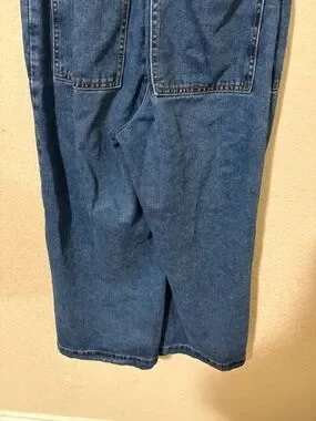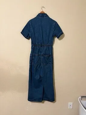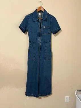 Casual dark blue denim jumpsuit with short sleeves. Front zip closure for easy on and off. Wide-leg silhouette for relaxed wear. Utility patch pockets at chest and hips. Simple collar and stitched seam details.