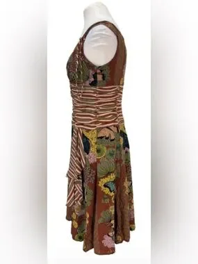 Size 10 Nannete Lepore 100% silk midi dress. Ruched bodice with ruffled bottom. Zipper at center back. Beautiful florals and butterfly’s.