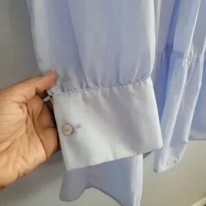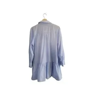 Zara light blue cotton blouse with embroidered eyelet detail at the chest and a relaxed, tiered silhouette.