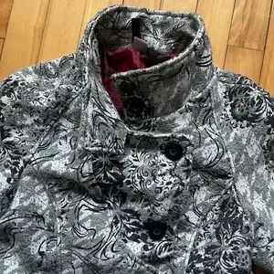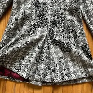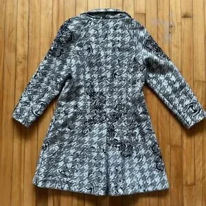 Keywords: statement coat, houndstooth print, comic print, designer coat, unique lining, red lining, black and white, womens fashion, outerwear, fashion coat, bold print, artistic, conversation starter, chic outerwear