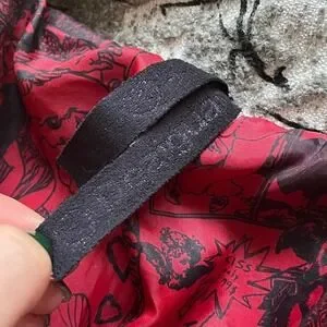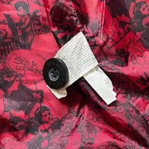 A striking Desigual statement coat showcasing a unique black and white houndstooth exterior. The eye-catching lining features a vibrant red background adorned with a bold black comic book-style print, adding a pop of unexpected personality. This coat is perfect for making a memorable entrance at a gallery opening, a sophisticated evening event, or a stylish brunch.