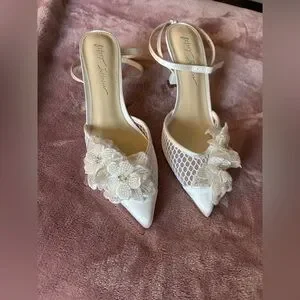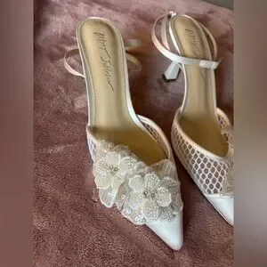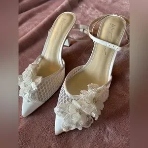 Elegant heels with mesh and floral accents. Perfect for weddings.