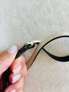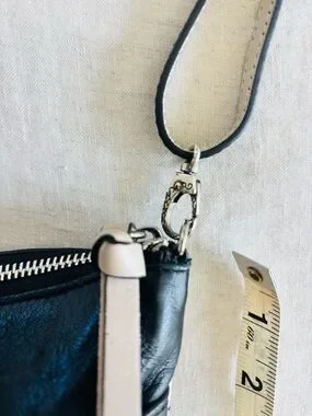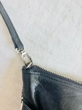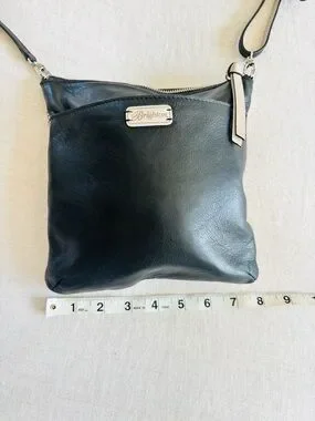 Brighton crossbody bag in smooth black leather. Cream-accent strap detail and decorative Brighton plaque. Zipper top closure and sleek silhouette. Ideal for hands-free daily use.
